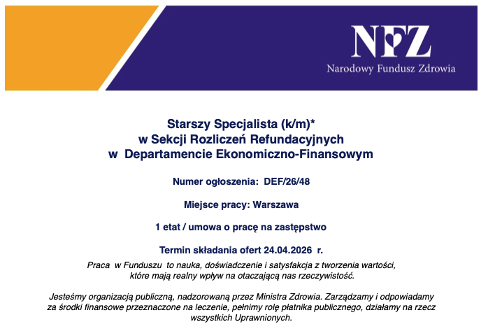 Starszy Specjalista (k/m)* w Sekcji Rozliczeń Refundacyjnych w Departamencie Ekonomiczno-Finansowym